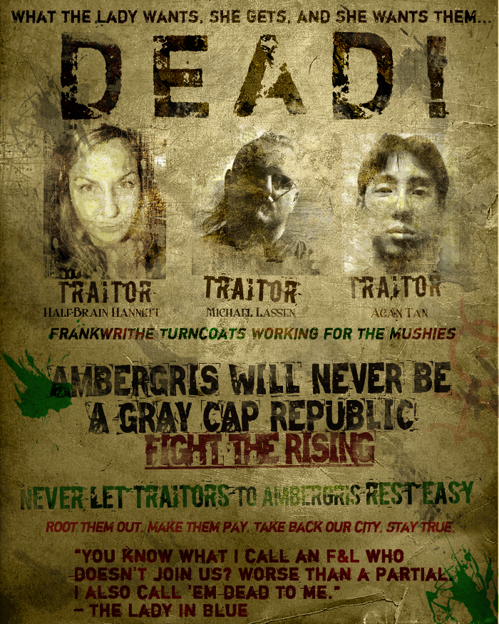 Insurgency postersThe Lady in Blue wants them dead. Want to be part of the confused political system in Finch? Put your headshot in this poster to insert yourself into the middle of the chaos. Support the graycaps, the Hoegbotton rebel factions or just spread the word about the traitors with these slogan banners. Collect these cards with all of the beloved Ambergris traitors, including the enigmatic "Cat." |